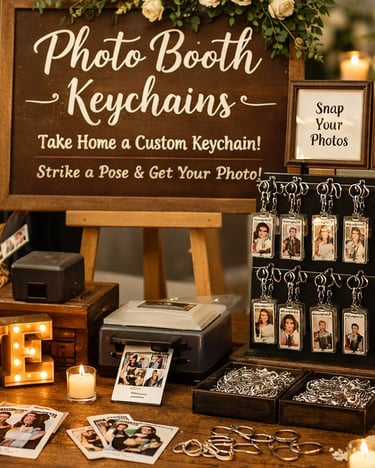 Guests take printed photos and receive their custom keychain on the spot